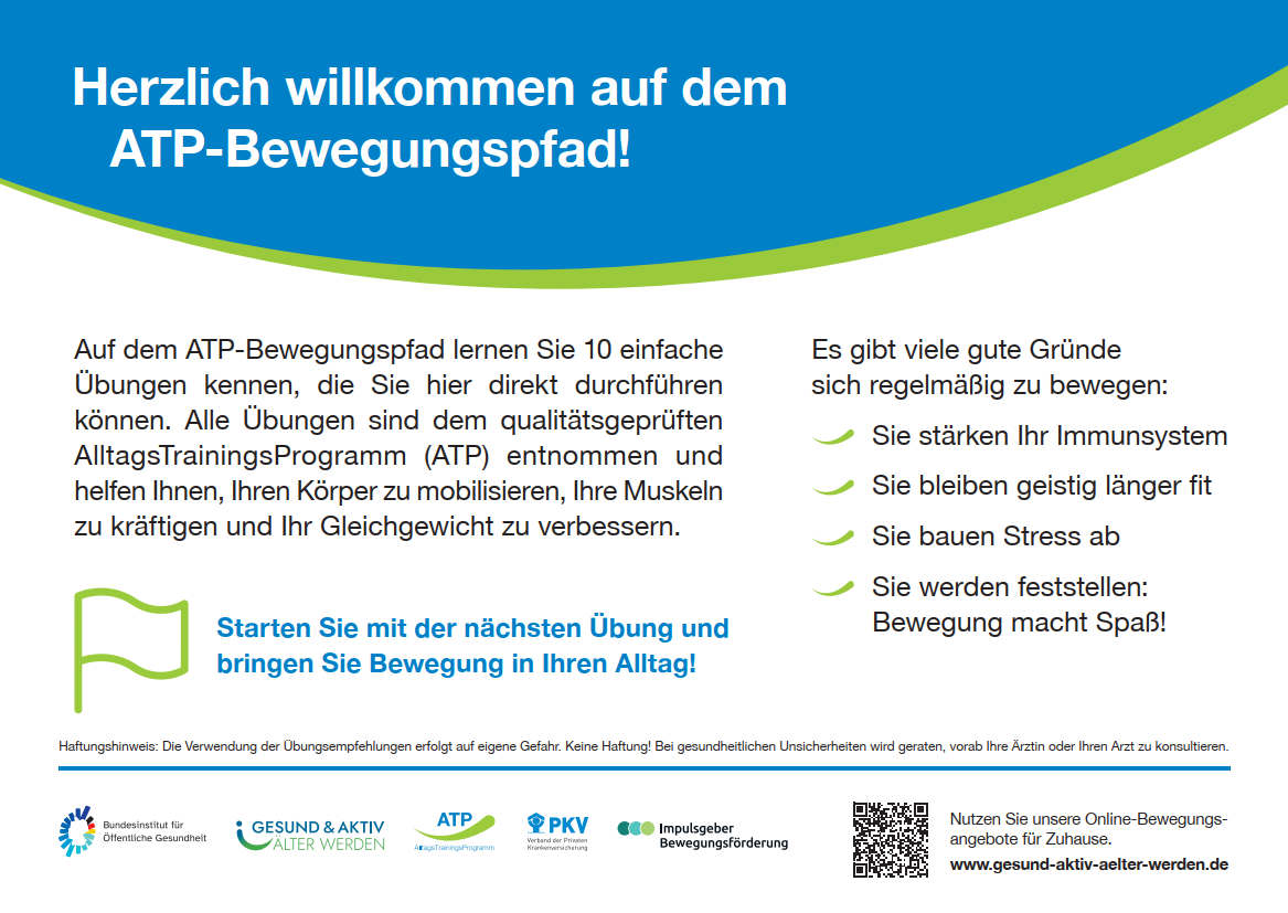 Ob alleine oder in der Gruppe – Bewegung im Freien hat durch die pandemiebedingten Einschränkungen der vergangenen Jahre an Bedeutung gewonnen. Daher hat die BZgA (seit Februar 2025 Bundesinstitut für Öffentliche Gesundheit) auf Basis der Übungen aus der Bewegungspackung einen Bewegungspfad zusammengestellt, der 10 Übungen und eine Startstation enthält. Die Übungen sind so gewählt, dass keine selbst mitgebrachten Materialien oder Gegenstände im öffentlichen Raum notwendig sind, aus deren Nutzung Wartungs- oder Haftungsansprüche resultieren könnten. Die Übungen erfordern keine Vorkenntnisse und sind leicht umzusetzen. Grundsätzlich ist eine Einweisung durch Übungsleiterinnen und Übungsleiter des ATP oder anderer Bewegungsprogramme nicht notwendig. Der Parcours eignet sich jedoch auch für Bewegungsübungen in der Gruppe oder angeleitete Trainingsangebote im Rahmen eines ATP-Kurses. Egal wie – mit dem ATP-Bewegungspfad kommen alle in Bewegung!